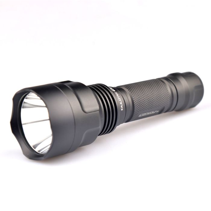 Фенерът Dulotec Convoy C8 Power е подходящ за гладкоцевна пушка и е с по-широк лъч и повече лумени за сметка на по-малка далекобойност (2500 лумена и 600 метра, точка 15 м/100м). Моделът работи и с дистанционен спусък, който можете да закупите отделно. С8 Power генерира доста топлина поради високата си мощност, но има вградена защита от прегряване, която не му позволява да загрее над 60 градуса и намаля светлината автоматично. Това се случва след около 3-5 минути непрекъснато светене в зависимост от външната температура. Батерията издържа около 40 минути на най-високия режим. Има 12 групи от режими, за да може да се настройва според желанието на потребителя във всеки момент само от бутона. По подразбиране фенерът идва програмиран само със силен режим, но получавате подробни инструкции за нагласяване. Фенерът е идеален за ловни приложения и този драйвер работи перфектно със заводския спусък за пушка.