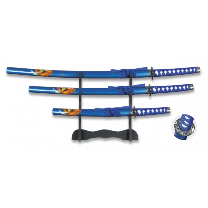 Комплектът 32220 е сет от 3 самурайски меча Катана Toledo Imperial. Остриетата са гладки, едностранно заточени, изработени от неръждаема карбонова стомана. Ръкохватките са обвити с декоративна оплекта и са снабдени с декорирани гардове. Каниите са декорирани. Мечовете се предлагат с дървена поставка.