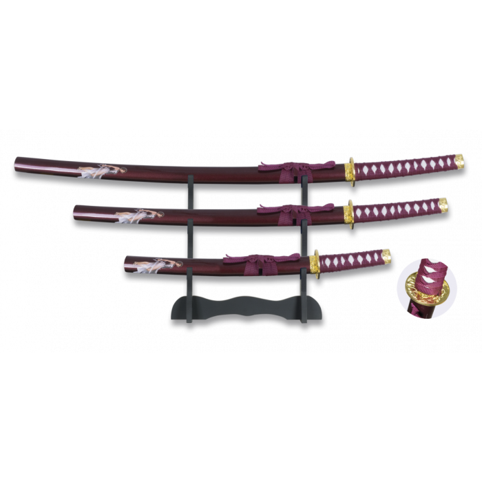 Комплектът 32222 е сет от 3 самурайски меча Катана Toledo Imperial. Остриетата са гладки, едностранно заточени, изработени от неръждаема карбонова стомана. Ръкохватките са обвити с декоративна оплекта и са снабдени с декорирани гардове. Каниите са декорирани. Мечовете се предлагат с дървена поставка.