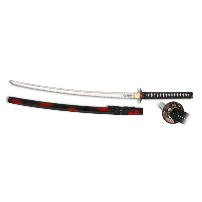 Самурайски меч Катана Toledo Imperial, подходящ за декориране и за колекционери. Острието е гладко, изработено от въглеродна стомана, обработено в маслена вана за максимална твърдост. Ръкохватката е декорирана с оплетка и е снабдена с тсуба (гард). Мечът се предлага с щампована кания и дървена поставка.
