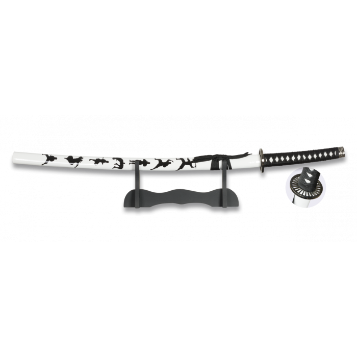 Самурайски меч Катана White модел 32226 Toledo Imperial, подходящ за декориране и за колекционери. Острието е гладко, изработено от въглеродна стомана, обработено в маслена вана за максимална твърдост. Ръкохватката е декорирана с оплетка и е снабдена с тсуба (гард). Мечът се предлага с щампована кания и дървена поставка.