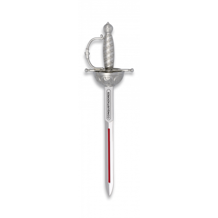 Декоративен миниатюрен меч на Конкистадорите (испанските завоеватели), изработен изцяло от Zamak - материал от цинк, алуминий, магнезий и мед. Ръкохватката е инкрустирана. Подходящ за декорация, колекционери и любители на испанския стил