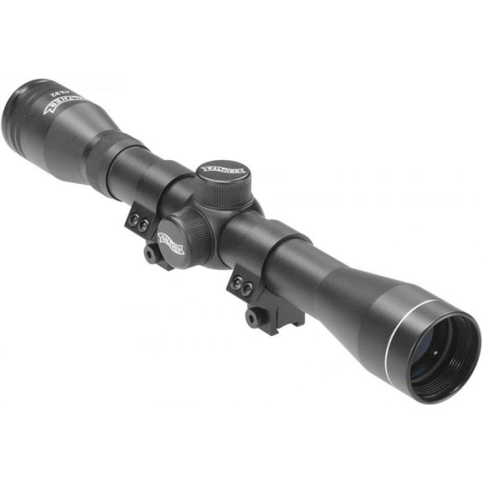 Оптика за въздушна пушка Walther 4 x 32. Подходяща за най - мощния въздушен клас въздушни пушки магнум. Включва крепежни елементи - пръстени за стандартно пневматично оръжие, база 11 mm.