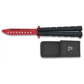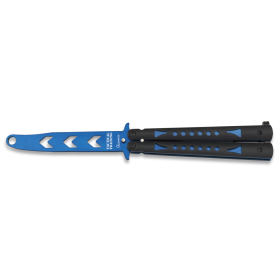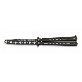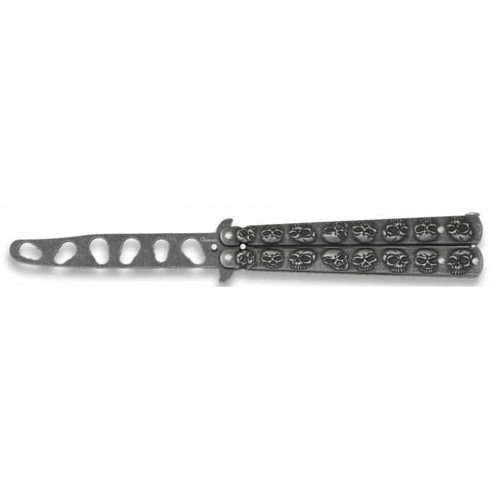 Напълно безопасен нож тип пеперуда за тренировки от испанската фирма Martinez Albainox модел 02216 Skulls. Острието му е обло, незаточено и изработено от неръждаема стомана с антирефлексно покритие с каменна баня. Ръкохватката му е стоманена, като разполага с фиксираща пластина в края си.