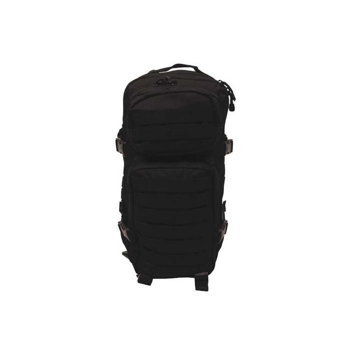 Раница Assault, снабдена с 2 основни отделения, затварящи се с цип. Разполага с 5 вътрешни и 2 външни джоба. С подплатени презрамки и гръб с цел осигуряване на максимален комфорт и удобство по време на носене. Раницата разполага и с множество ремъци, позволяващи прикрепяне на допълнителни елементи. Произведена от 100% полиестер. Вместимост: 30 л. Размери: 45 х 25 х 20 см. Предлага се в черен цвят.