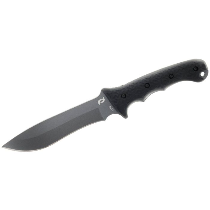 Масивен нож с конструкция Full Tang, с дебело острие от AUS-8 неръждаема стомана, защитено с тефлоново покритие. Drop Point форма на острието с гладки режещи ръбове. Ергономична, неплъзгаща се ръкохватка. Твърда полимерна кания с точило и кремък.