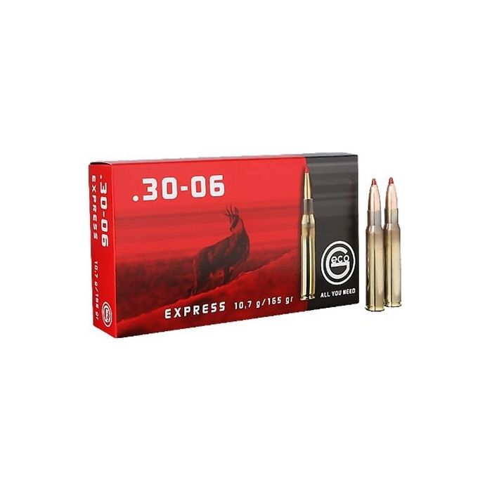 The GECO EXPRESS cartridges in .30-06 Springfield caliber are designed for medium to large game hunting at long ranges. The bullet features an aerodynamic profile with a polymer tip and tapered tail design, ensuring a flat trajectory, high accuracy, and rapid expansion upon impact. It delivers outstanding ballistic performance and excellent stopping power.