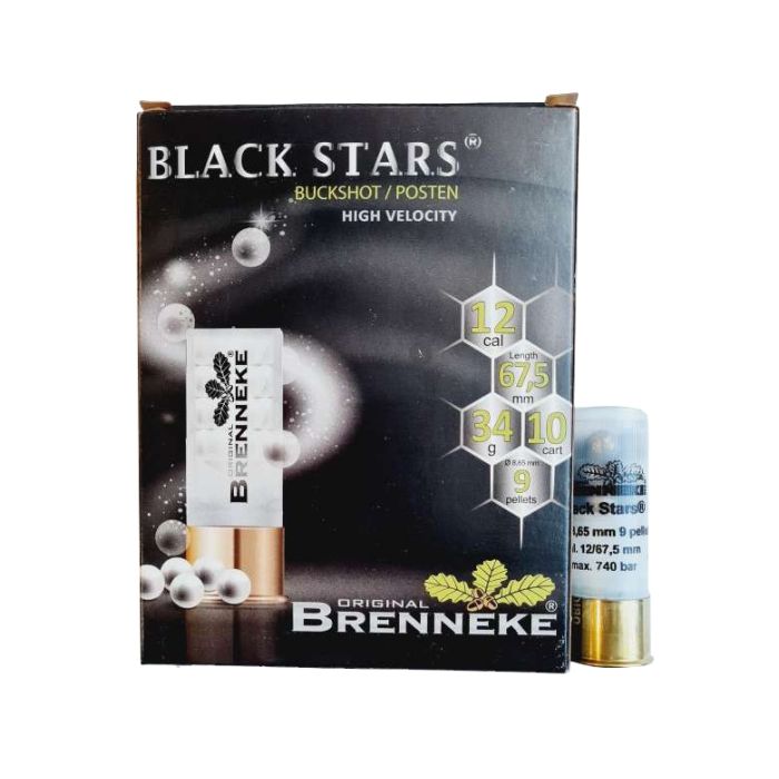 The Brenneke - Black Stars 13/0 cartridge in 12/67.5 caliber has a clear case. Its weight is 34 grams with 9 balls of size 8.65 mm. The maximum cartridge pressure is 740 bar.
