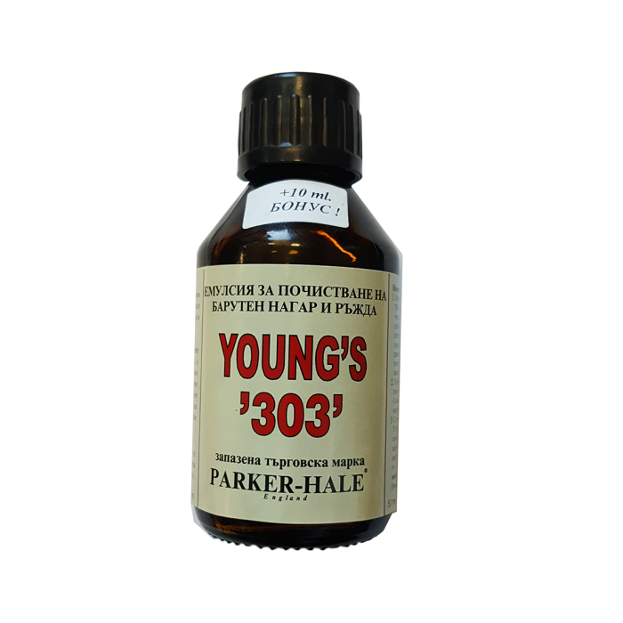 Добре познато и широко разпространено средство за почистване на късо и дълго огнестрелно оръжие от барутен нагар и ръжда. Емулсията Young's 303 е сред най-добрите разтворители на барутен нагар и предпазва цевта от ръжда неограничено дълъг период. Young's 303 е изключително ефикасно средство за предпазване от ръжда на металната повърхност на оръжието, тъй като при намазване образува върху нея херметичен слой. Young 303 не е смазка и не бива да се използва за смазване на подвижните части и заключващите механизми на оръжието. 50 ml. + 10 ml. бонус
