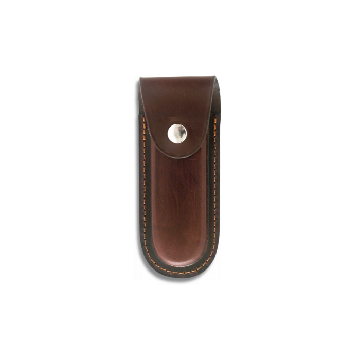 Sheath with that can be carried on a belt used for folding knife. It is made of leather in brown color. Easy to close and secure your knife. Dimensions: 14.5 x 6 cm