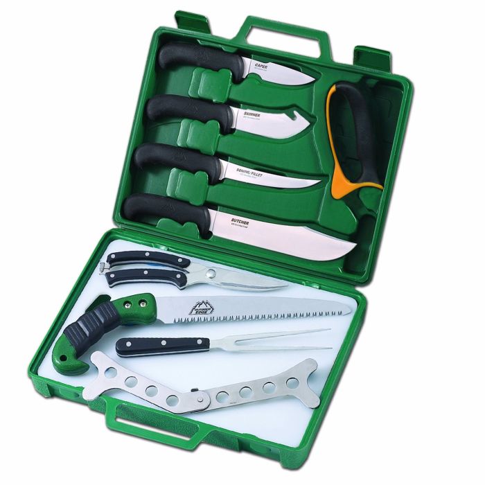 High carbon 420 stainless steel holds a superior edge The most complete portable home processing knife set Ergonomic rubberized Kraton handle ensures a secure non-slip grip even when wet Durable hard-side carrying case