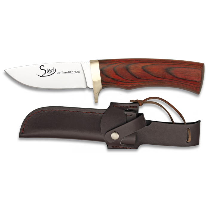 - Blade Material: Stainless Steel 7cr17 mov HRC 56-58 - Blade length: 8.7 cm - Material of the handle: Red Satina - Total length: 20.7 cm - Leather Sheath