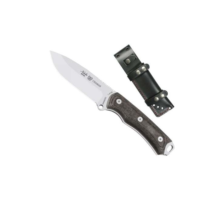 Hunting knife Miguel Nieto Chaman, With full tang design of the blade made of stainless steel. The handle is ergonomic with a comfortable grip made of Micarta, with a belt opening at the end. The knife is available with a leather canvas with different positioning capabilities.