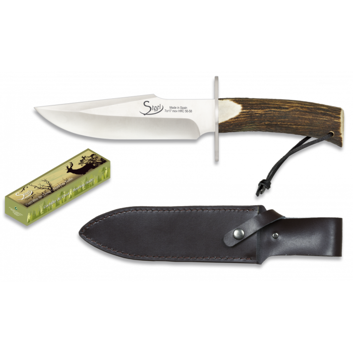 Author's rights Designed in Spain Brand: STEEL 440 Hunting knife Handle: Deer stag Bolster: Steel Blade: Stainless steel Blade size: 16 cm Blade thickness: 3.8 mm Total size: 28.5 cm Leather sheath