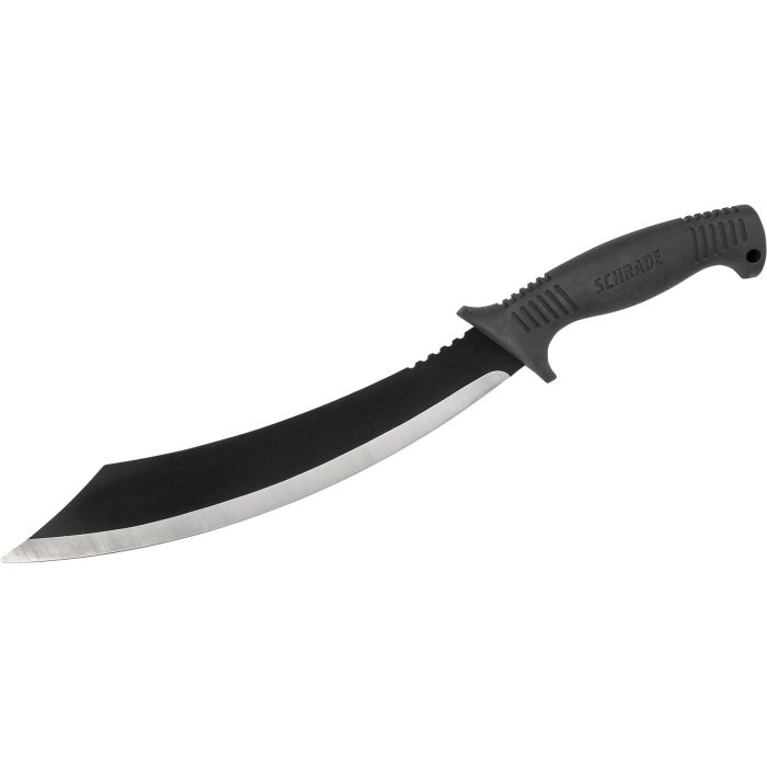 The Schrade SCMACH1 Machete is an outdoorsman's dream. It's important that a machete has strength and durability to go the distance when out in the wilderness. The 3Cr13 stainless steel blade is 12.25" long with full tang construction. Thermoplastic rubber handles ensure that your grip is steady whether used in rain or shine. It comes with an embroidered nylon sheath and a lanyard hole.