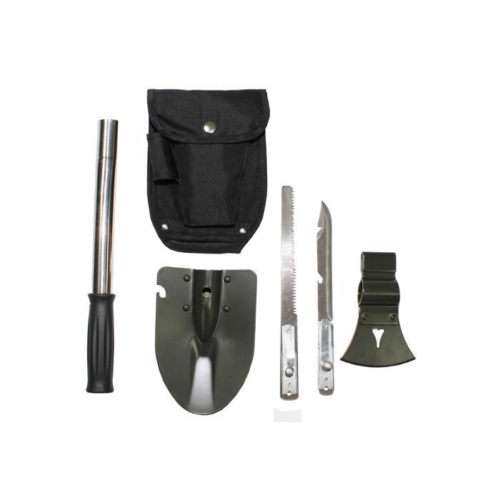 Multifunctional set by the German company MFH. Set 6 in 1 that consists of: universal handle, ax, shovel, saw, knife wih a bottle opener and carrying case that can be attached to a belt or a backpack. Extremely suitable for camping and outdoor activities. You will have everything you need in one.