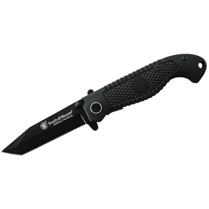 Smith & Wesson Special Tactical Liner Lock Folding Knife, Black 7Cr17 High Carbon Stainless Steel Clip Point Tanto Blade with Thumb Knob and Index Flipper, Textured Black ABS with Rubber Coating Handle with Raised Jimping, Lanyard Hole, and Pocket Clip