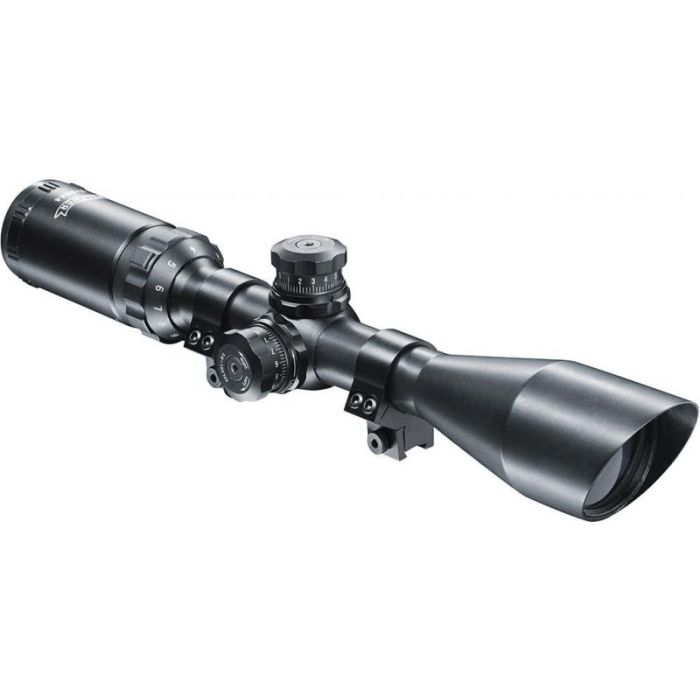 A rifle scope in the Walther Range with variable magnification and a MilDot reticle. The sunshade prevents reflections in the target image. The mount fits 11 mm dovetail rails. The easy-to-grip adjustment ring makes handling easy.