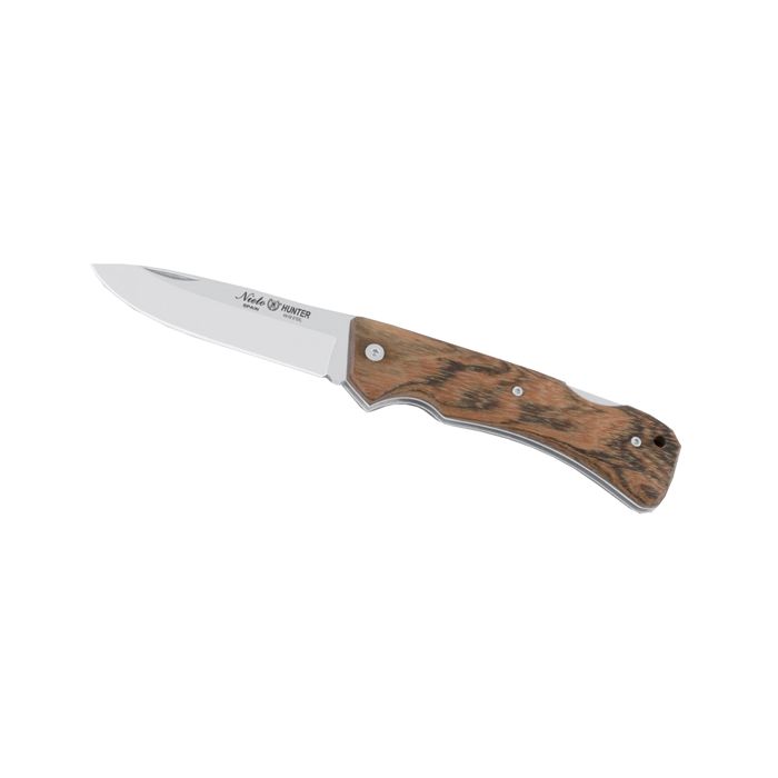 Miguel Nieto folding hunting knife of the Hunter Series with one-sided sharpened blade made of stainless steel with the brand AN-58. The handle is ergonomic with a comfortable grip made of wood Bocote, with a belt opening at the end. The knife has a lockback system that prevents it from accidentally opening.