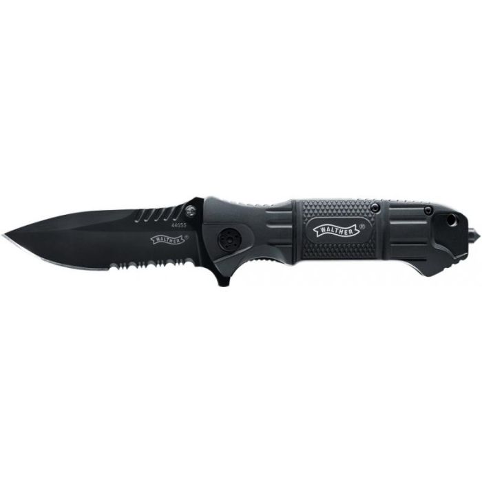 The Black Tac is a full-fledged one-hand knife with a liner lock and a flipper to assist in opening. The massive spear-point blade, with a partial serration, is dull black, underlining the Black Tac\'s bold look.