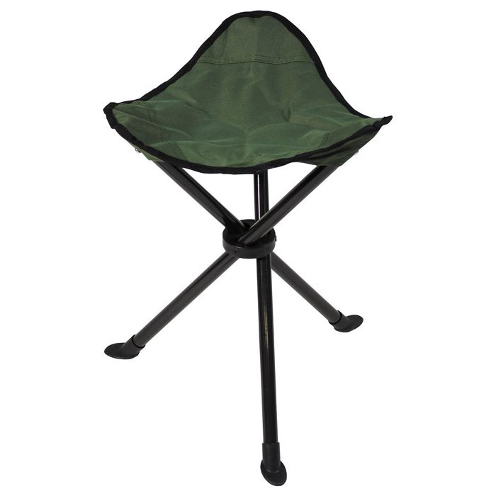 Folding chair equipped with a strap for carrying and a bag for transportation. Made of metal and synthetics. Height: 40 cm.