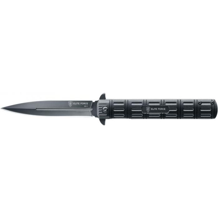 This black folder is characterized by a symmetrical blade and handle. The aluminum handle holds a black coated spear point blade made of high-grade 440C steel. It can be opened with two flippers and has a liner lock mechanism. The clip is removable.