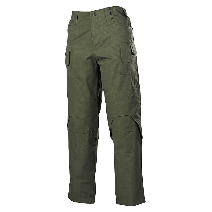 Combat Pants, "Mission " with 2 side and 2 back pockets, 2 side flap patch pockets, 2 small patch thigh flap pockets, reinforced seat and knees also have pockets for protectors (27691A), adjustable waistband, calf area and cuffs with velcro, trouser fly with buttons, 65 % cotton, 35 % nylon.