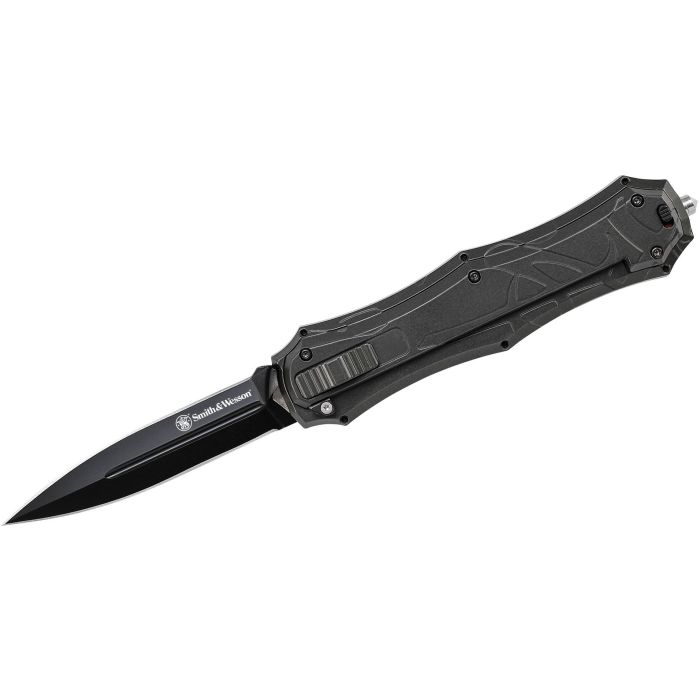 The Smith & Wesson® assisted opening OTF features an ergonomic finger actuator. The dual-edge spear tip blade is made of AUS-8 steel. This knife also features a glass breaker for emergency situations.