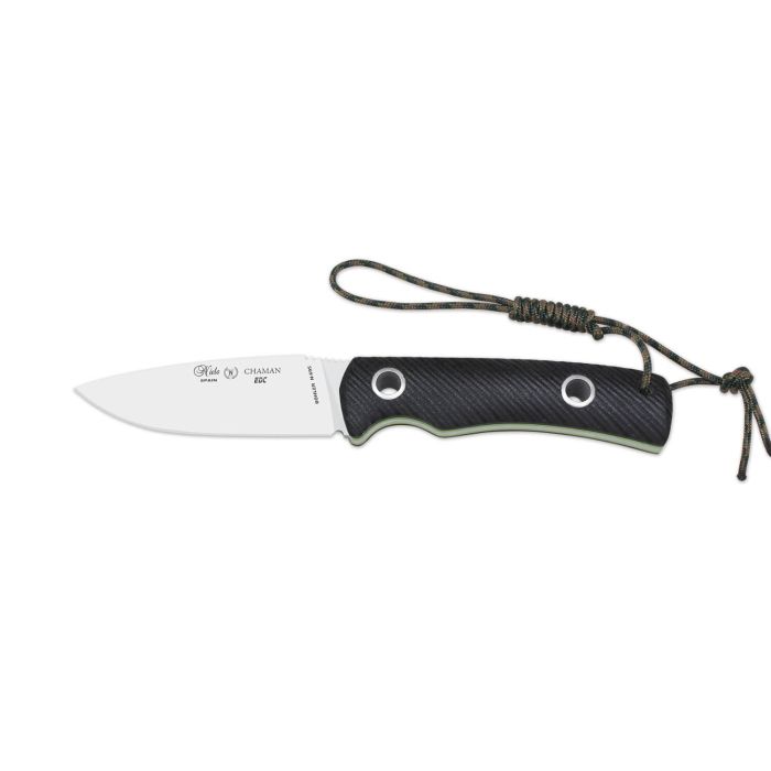 Удобен ловен нож от серията "CHAMAN EDC" на "Мигел Нието" с ергономична дръжка направена от G-10 (масивен термоустойчив материал от стъклени влакна, импрегниран със смола и подложен на обработка). Предлага се с кожена кания в черен цвят.