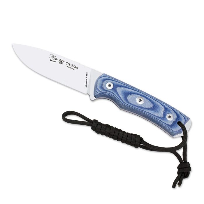 Удобен ловен нож от серията "Chaman Bushcraft" на "Мигел Нието" с ергономична дръжка направена от двуцветен материал Mikarta. Предлага се с кожена кания в черен цвят.