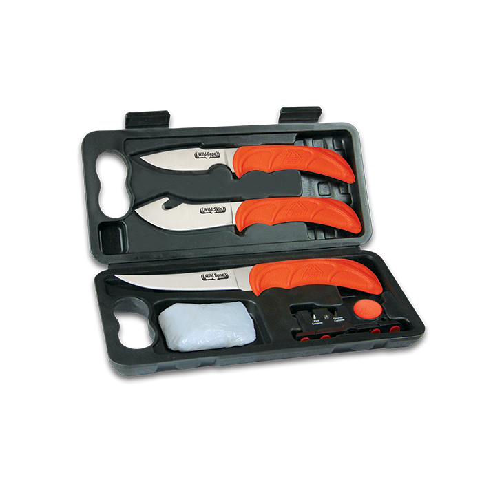 Най-лекият и най-компактен комплект ловни ножове с твърд калъф за носене, идеален за използване и в домашна обстановка. С тегло от 20 унции този пълен комплект от 6 части включва: нож Caping за прецизна обработка на месо, нож Skinner с кука за дране и нож Boning за обезкостяване и филетиране, ръкавици, двустепенно точило със заточващи камъни от керамика и карбид + полимерен калъф. Неръждаемата стомана 420J2 на остриетата е прецизно термично обработена и ръчно дозаточена за по-дълго запазване на остротата на ръба и по-голяма работоспособност. Ръкохватките са TPR с инкрустирани рога на лос, осигуряващи отлично сцепление без приплъзгване дори при мокри ръце, а оранжевият им цвят намалява вероятността да бъдат загубени, като ги прави леснооткриваеми.