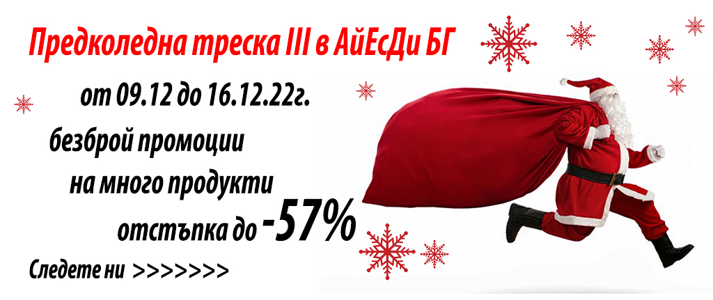 По време на "Предколедната треска" поръчките направени през www.isd-bg.com, на телефон 0885042084 или 029835014 / 029831217 ще се обработват в рамките на няколко дни. Ще се изготви график по реда на постъпване, като ще са приоритетни постъпилите през онлайн магазина, всеки клиент ще получи потвърждение по имейл и данни за доставката при финализиране на поръчката. Промоциите ще важат и за физическия ни магазин на адрес: гр. София, бул. Ботевградско шосе 247.