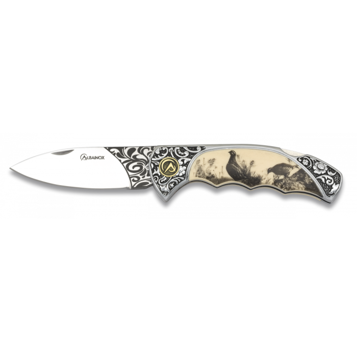 Cuțit de buzunar pliabil de la compania spaniolă Martinez Albainox cu mâner decorat cu imprimare de prepeliță și lamă din oțel inoxidabil. Potrivit pentru colecționari, turiști și iubitori de produse spaniole cu design inovator și elegant.