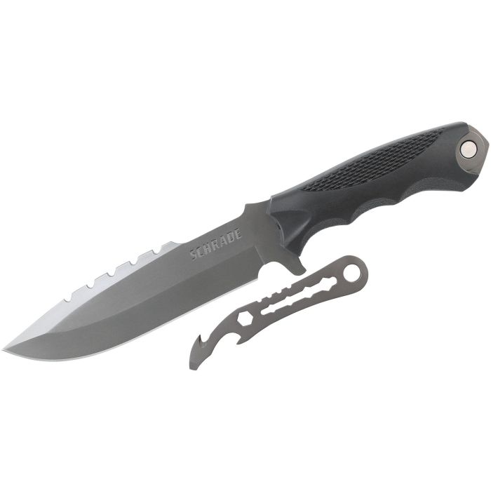 Сървайвър тактически нож Schrade® Extreme Survival, модел SCHF27 с Full Tang фиксирано острие, изработено от вискокачествена неръждаема стомана с марка 8Cr13MoV и титаниево покритие. Ръкохватката му е с удобен захват с чирени от TPE. В края на ръкохватката има отвор за ремък и слот с мултифункционален инструмент, изработен от неръждаема стомана с марка 3Cr3 с титаниево покритие. Ножът се предлага със синтетична кания и Lock ринг.