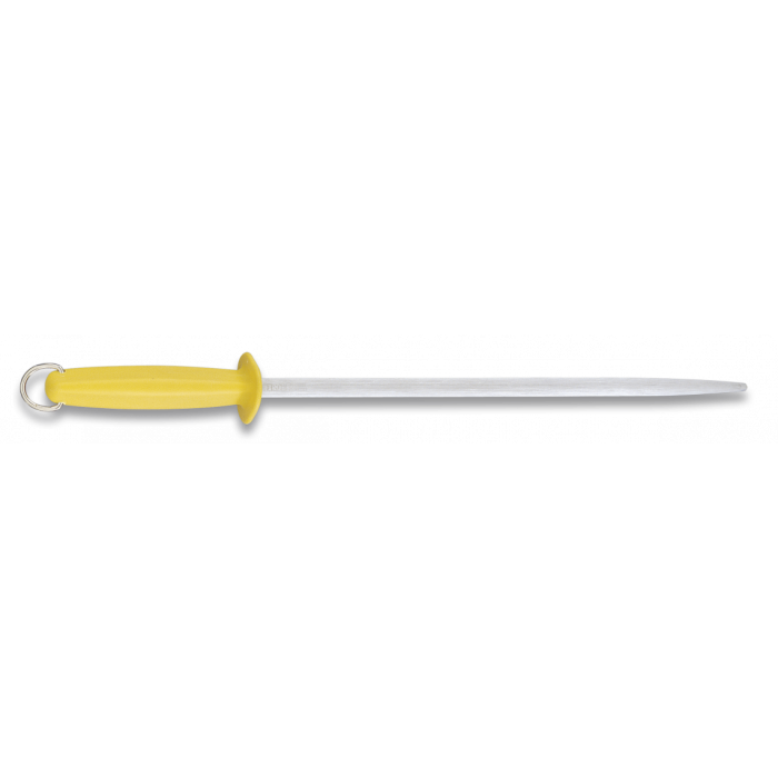 Oțel de ascuțit profesional de înaltă calitate de la compania franceză FISCHER. Masa este instrumentul ideal pentru ca bucătarii să își ascută cuțitele de bucătărie. Are un mâner sintetic galben cu design ergonomic și un inel pentru agățat. Tija ovală de ascuțit are o lungime de 30 cm și este fabricată din oțel inoxidabil, asigurând rezistență. Extrem de potrivită pentru ascuțirea zilnică a diferitelor cuțite din oțel.