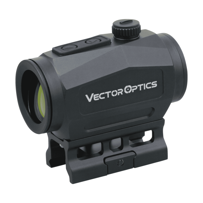Specificații: Dimensiunea lentilei ferestrei: 29mm Lungime totală: 80mm/3.1" Lungime de montare: 56mm/2.2" Lățime totală: 49mm / 1.9" Înălțime totală: 75mm / 2.7" Greutate: 200g / 7.1oz Distanța până la ochi: liberă Acoperire optică: multi-coated Paralaxă: <1MOA @ 100 de metri Setări paralaxă: 100 de metri Corecție verticală: >45MOA Corecție orizontală: >45MOA Dimensiunea punctului: 2MOA Intensitatea punctului: 8 nivele + 2 nivele NV Temperatura de funcționare: -20 ~ +50 ° C Material: aliaj de aluminiu Tip baterie: CR2032 (nu este inclusă) Durata de viață a bateriei: > 50.000 de ore la cel mai mic punct vizibil Acoperire: negru mat Montare: țesător și bază picatinny Rezistent la apă IPX6 (1 metru sub apă în 30 de minute), rezistent la șocuri de până la 800g Vine complet cu montură joasă și înaltă, capace de cauciuc pentru lentile și cârpă de curățare