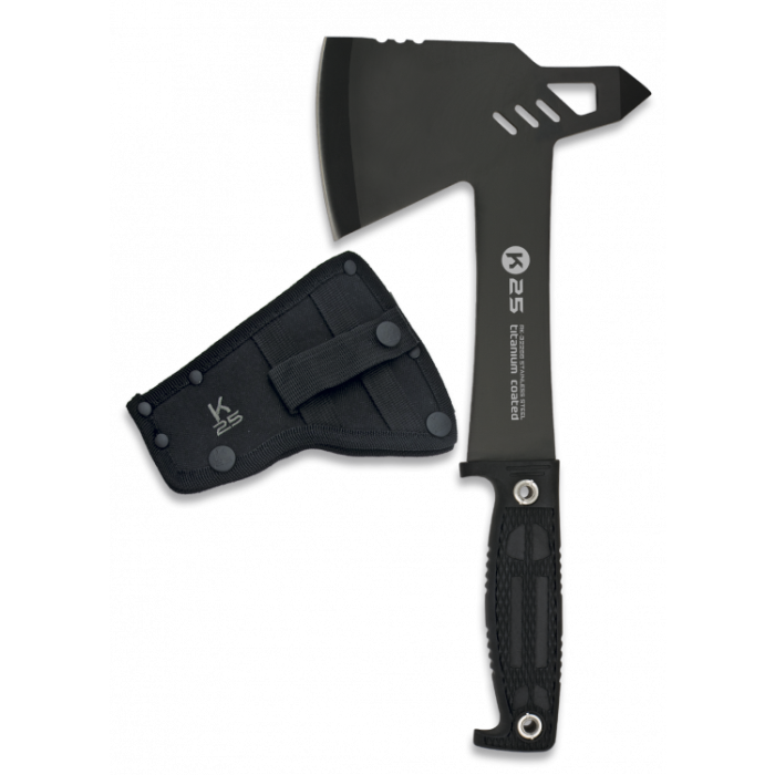 Topor tactic model 32266 Tactical de la compania spaniolă K25 specializată în producția de cuțite, topoare, machete și alte articole tactice. K25 oferă o gamă largă de produse destinate atât profesioniștilor, cât și amatorilor din armată, poliție și securitate. Modelul prezentat al toporului este fabricat în întregime din oțel inoxidabil 7Cr17Mov cu rezistență ridicată la coroziune , acoperit suplimentar cu un strat de titan. Construcția toporului este încorporată în mânerul conturat, care este fabricat din cauciuc texturat antiderapant, oferind o prindere sigură chiar și atunci când purtați o mănușă. Vine complet cu un teacă pentru depozitarea în siguranță a uneltelor și posibilitatea de a fi atașat la o curea.