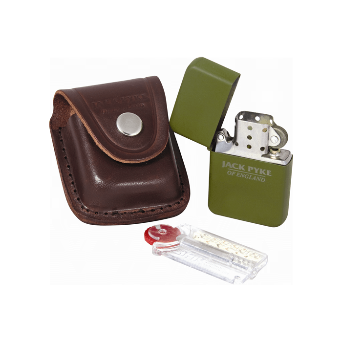 Запалка Jack Pyke стил Zippo в цвят маслинено зелен. Запалката се предлага в комплект с кожен калъф, снабден с щипка за колан; резервни фитилчета и кремъчни камъчета.