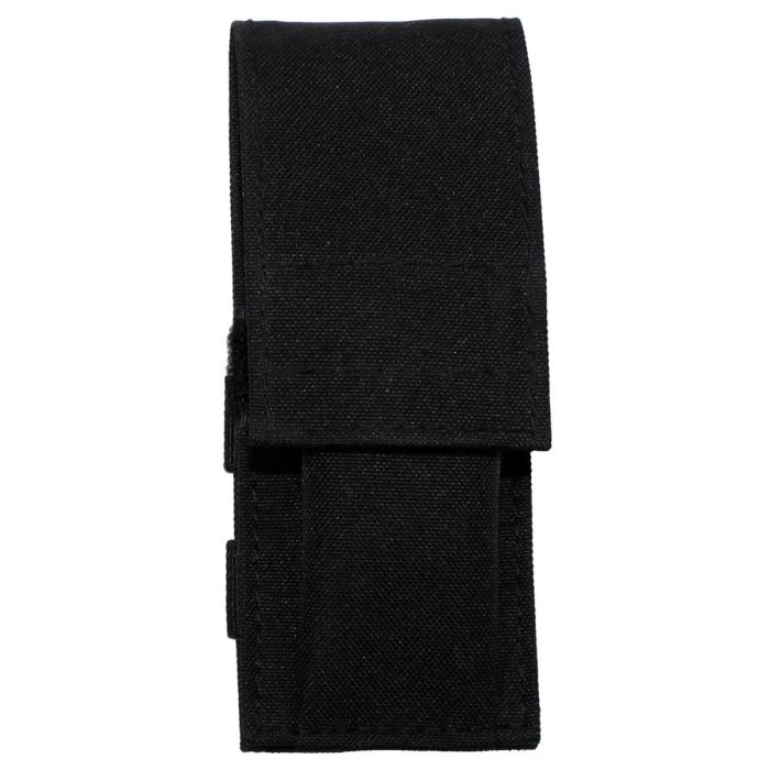 Teacă de cuțit sintetică de culoare neagră de la compania germană Fox Outdoor. Se fixează cu fermoar cu cârlig și buclă. Poate fi fixat pe o curea de până la 7,5 cm lățime. Are două benzi elastice de aproximativ 4cm pentru fixare transversală.