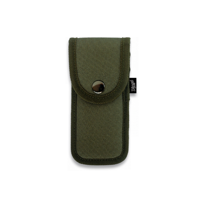 Geantă de transport cu curea pentru cuțit pliabil, fabricată din material sintetic. Husa are două compartimente, fixate cu un buton "tic-tac". Disponibilă în culoarea verde măsliniu.
