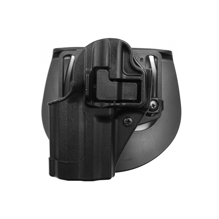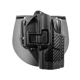 Holster din polimer Serpa CQC cu un design unic și o acoperire caracteristică cu fire de carbon, care vă face să uitați de vechile modele cu fermoar, încordând și încetinind procesul de scoatere a armei. Sistemul patentat de blocare "Serpa" blochează clema trăgaciului armei atunci când este retrasă în holster și o menține stabilă până la reholstare. Acest lucru se realizează printr-o mișcare normală a mâinii de tragere și a degetului arătător. Degetul arătător al mâinii de tragere deblochează mecanismul prin apăsarea unui buton special. Manipularea este rapidă și ușoară, deoarece se conformează mișcărilor naturale ale trăgătorului, spre deosebire de încuietorile cu degetul mare, care sunt uneori dificil de manipulat cu o singură mână. Toate husele din această serie vin complete cu o platformă de curea și un accesoriu suplimentar la curea cunoscut sub numele de "paletă". Se potrivește modelului H&K P30.