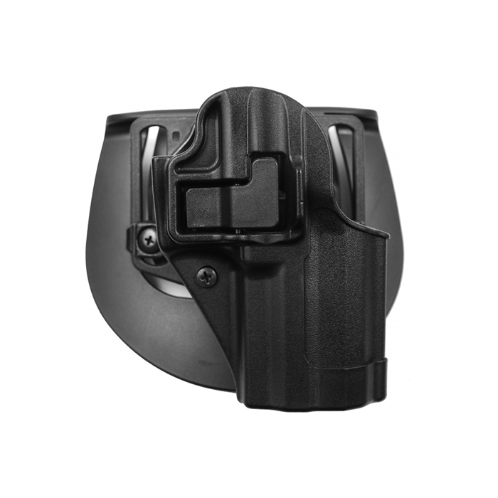 Holster din polimer Serpa CQC cu un design unic și o acoperire caracteristică cu fire de carbon, care vă face să uitați de vechile modele cu fermoar, încordând și încetinind procesul de scoatere a armei. Sistemul patentat de blocare "Serpa" blochează clema trăgaciului armei atunci când este retrasă în holster și o menține stabilă până la reholstare. Acest lucru se realizează printr-o mișcare normală a mâinii de tragere și a degetului arătător. Degetul arătător al mâinii de tragere deblochează mecanismul prin apăsarea unui buton special. Manipularea este rapidă și ușoară, deoarece se conformează mișcărilor naturale ale trăgătorului, spre deosebire de încuietorile cu degetul mare, care sunt uneori dificil de manipulat cu o singură mână. Toate husele din această serie vin complete cu o platformă de curea și un accesoriu suplimentar la curea cunoscut sub numele de "paletă". Se potrivește modelului H&K P30.
