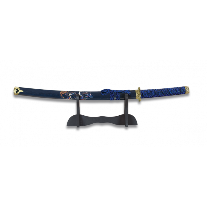 Sabie de samurai Katana Wakizashi model 31973 Toledo Imperial, potrivită pentru decorare și pentru colecționari. Lama este netedă, fabricată din oțel carbon. Tocul este decorat cu împletitură și este prevăzut cu un tsuba (apărătoare). Sabia este livrată cu o teacă gofrată și o teacă din lemn.