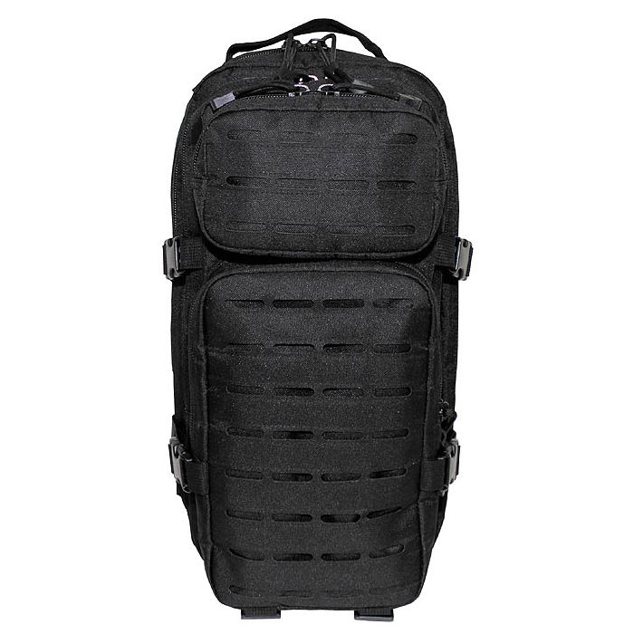 Rucsac Assault, echipat cu 2 compartimente principale, închidere cu fermoar și plasă. Are 2 buzunare interne (cu organizator și plasă) și 2 externe. Cu curele de umăr și spate căptușite pentru a asigura confort maxim și confort în timpul transportului. Rucsacul are, de asemenea, mai multe curele MOLLE pentru a permite atașarea de articole suplimentare. Fabricat din poliester 100%. Disponibil în negru.