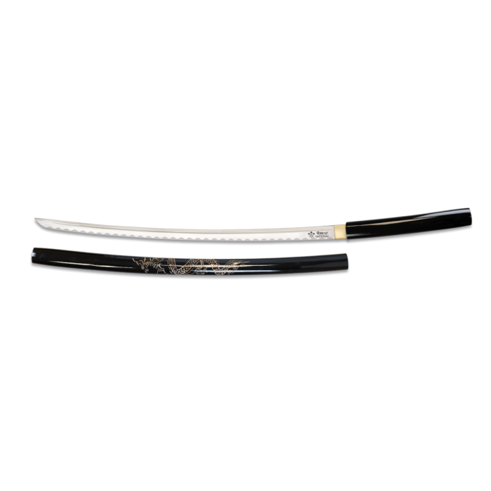 Sabie de samurai Katana 32576 Black Dragon de la compania spaniolă TOLE10 Imperial. Sabia are o lamă cu un singur tăiș fabricată din oțel carbon călit în ulei. Tocul are o mâner confortabil, realizat din lemn de culoare neagră. Sabia este livrată cu o teacă din lemn ștanțată cu imaginea unui dragon și o cutie.