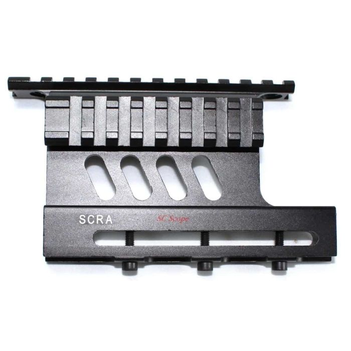 Montaj lateral pentru carabiniere AK cu o șină picatinny pe laterale și una pe partea de sus.