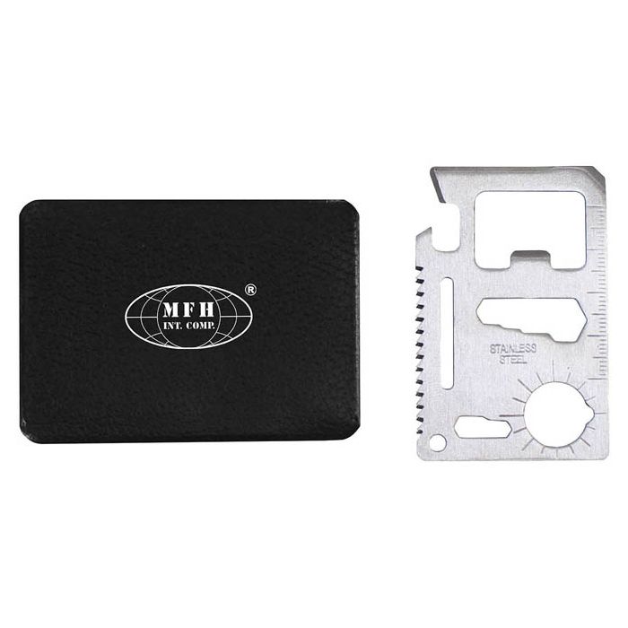 Unealtă de supraviețuitor cu 11 funcții: deschizător de conserve, cuțit, șurubelniță, riglă, deschizător de sticle, cheie multifuncțională mare, cheie, lamă-trion, locație de calcul, cheie multifuncțională mică, orificiu pentru centură/ănel de chei.