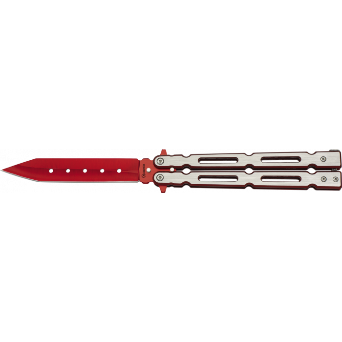Сгъваем джобен нож тип пеперуда с острие от неръждаема стомана с червено антирефлексно покритие. Ръкохватката е изработена от неръждаема стомана, като по нея има отвори, които олекотяват ножа, разполага с фиксираща пластина. Подходящ за ежедневна употреба.