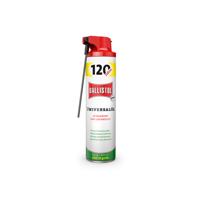 Ballistol Universal Oil винаги е бил истински универсален продукт и впечатлява с широката си гама от приложения. За да отбележи годишнината от създаването си, универсалното масло се предлага в ограничено издание на спрей. По повод 120-годишнината, юбилейното издание съдържа 400 ml + 120 ml, т.е. 520 ml универсално масло.