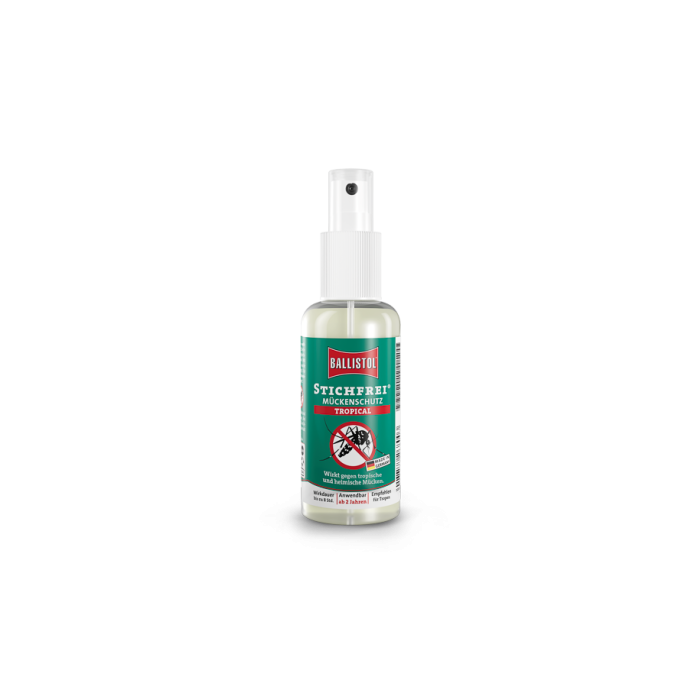 Независимо дали сте в тропическите гори, на сафари или на почивка на море – в тропическите региони комарите и кърлежите не само са досадни, но могат да пренасят и опасни болести. С репелента Ballistol Stichfrei Tropical сте надеждно защитени до 8 часа – без DEET, но с високоефективен Икаридин (20%) и Цитрепел (5%).
